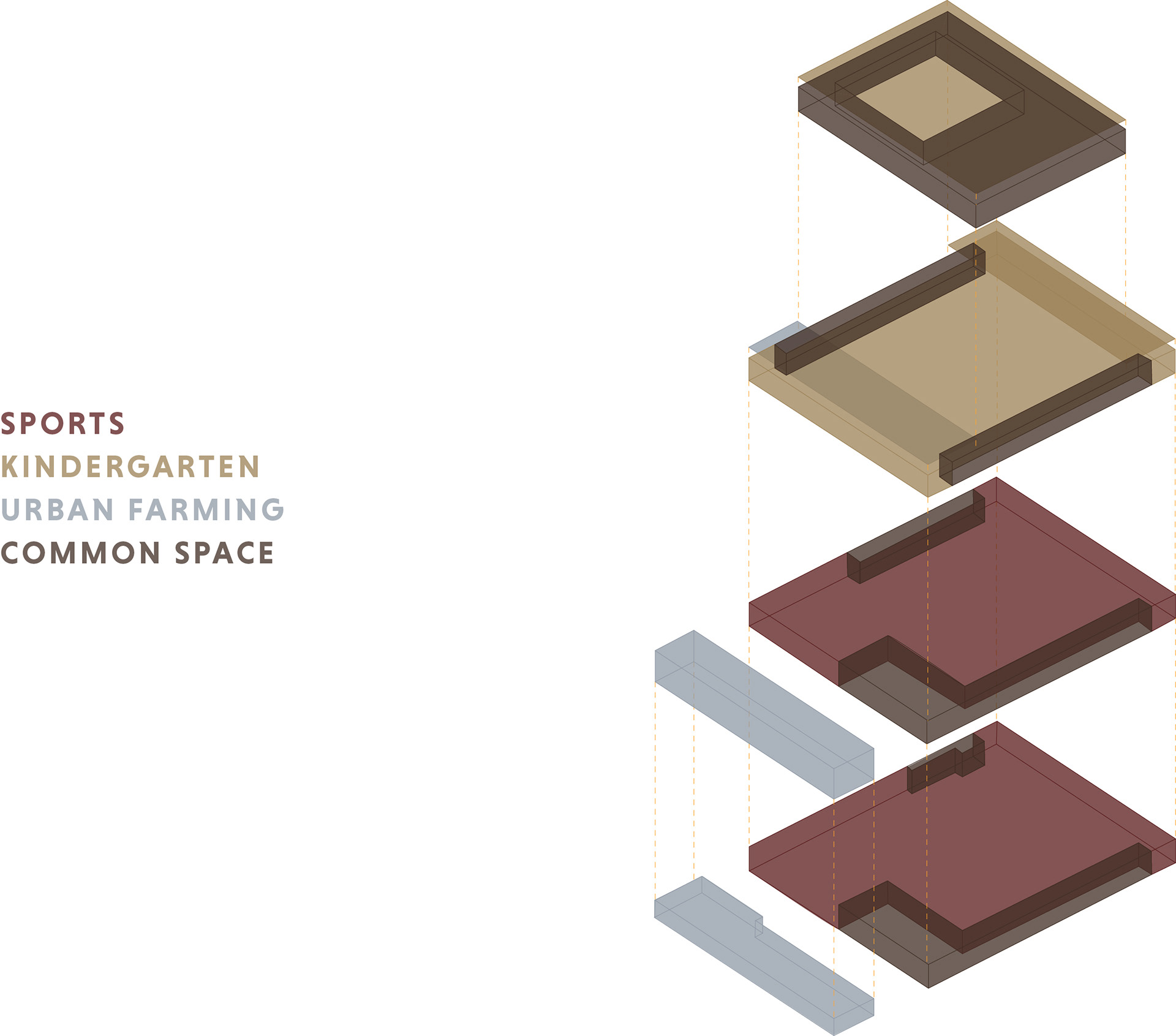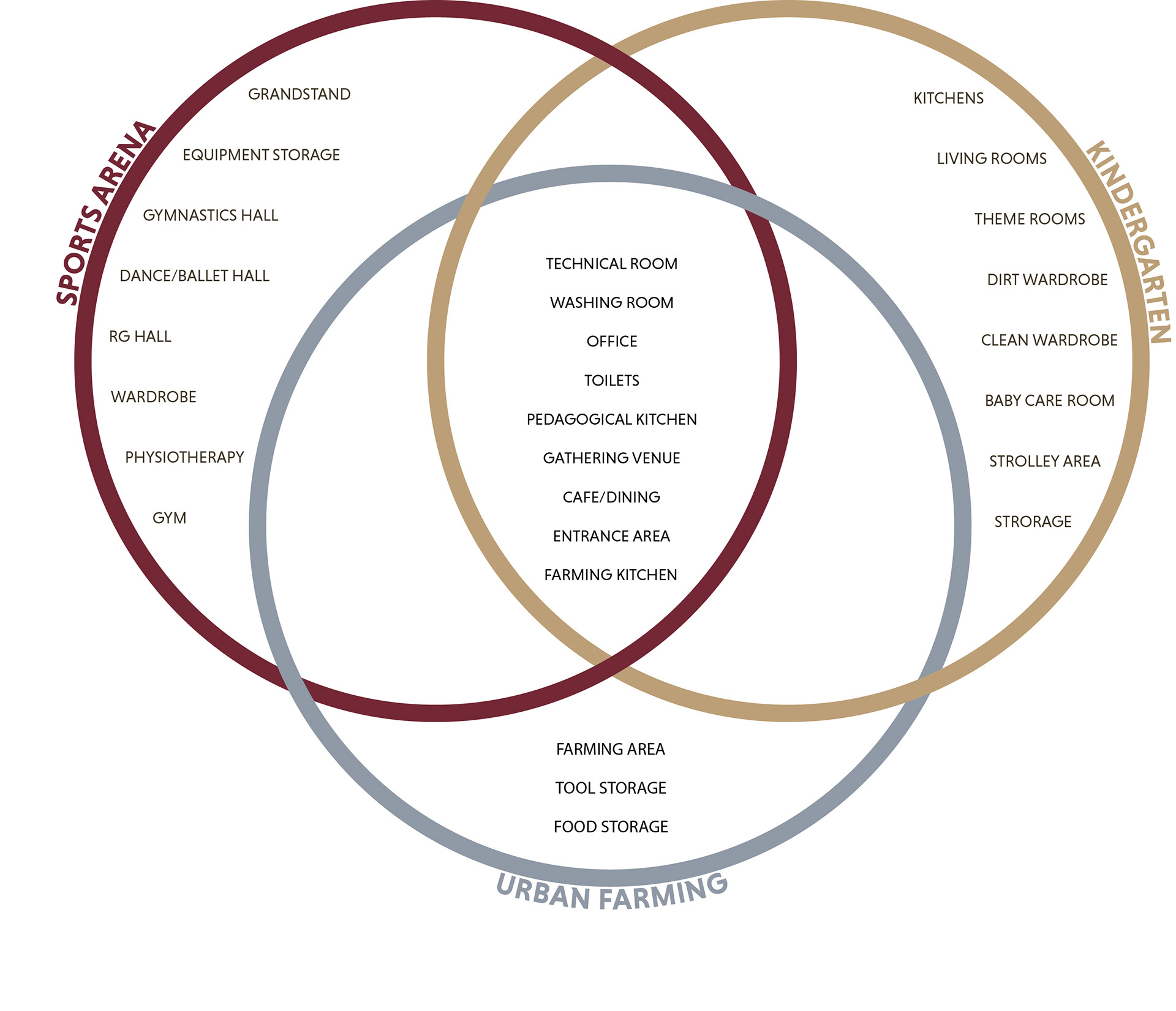 Central to the task was finding the intersection between the different programs. These functions are located adjacent to the common areas and are fully shared spaces across everyone in the building. The Union also includes other more specialized functions which could be shared during specific times during the day, week or year, depending on availability. All the programs should benefit from each other and be able to use each other's spaces.