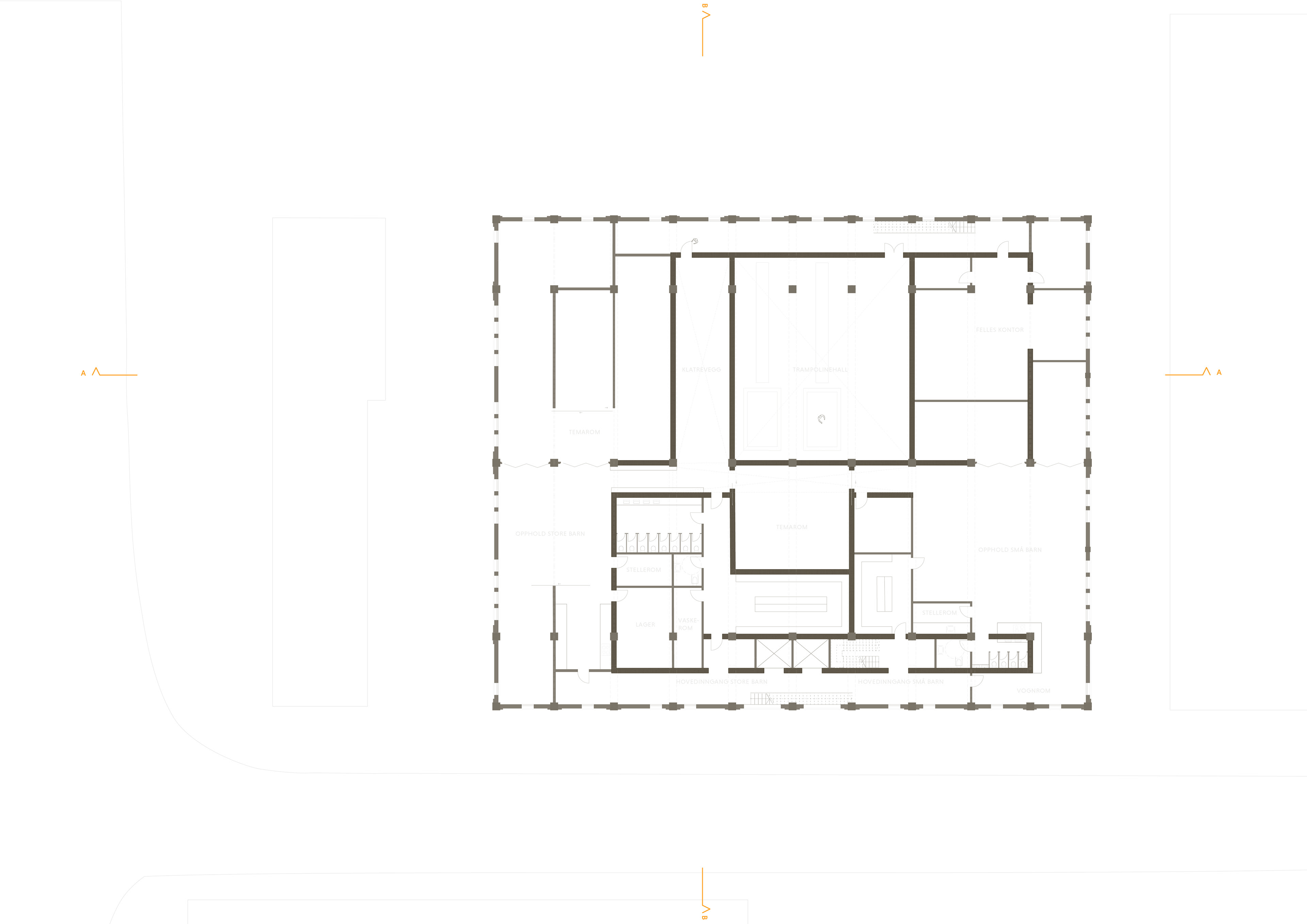 Plan 3 - Kindergarten including the trampoline hall in the center. Small children department on the east end and old children department on the west end. Shared gathering room in the center and possibility to open between the two departments if wanted. Climbing wall in the two-story-high room left to the trampoline hall. Office on the right to the trampoline hall, shared by all users of the building.
